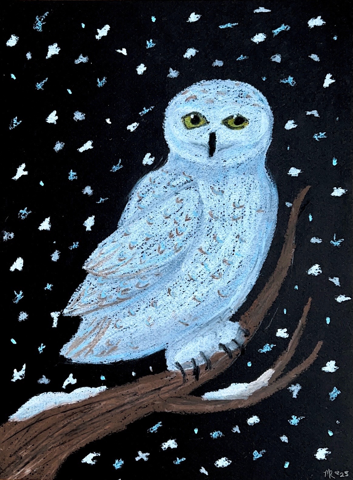 January 8 – Snowy Owl in Oil Pastel – on black textured pastel paper– Snowy Owls are a stunning species with bright yellow eyes and soft white feathers. They are the largest owl species in North America by weight. Myleigh Rohner, Guest Instructor