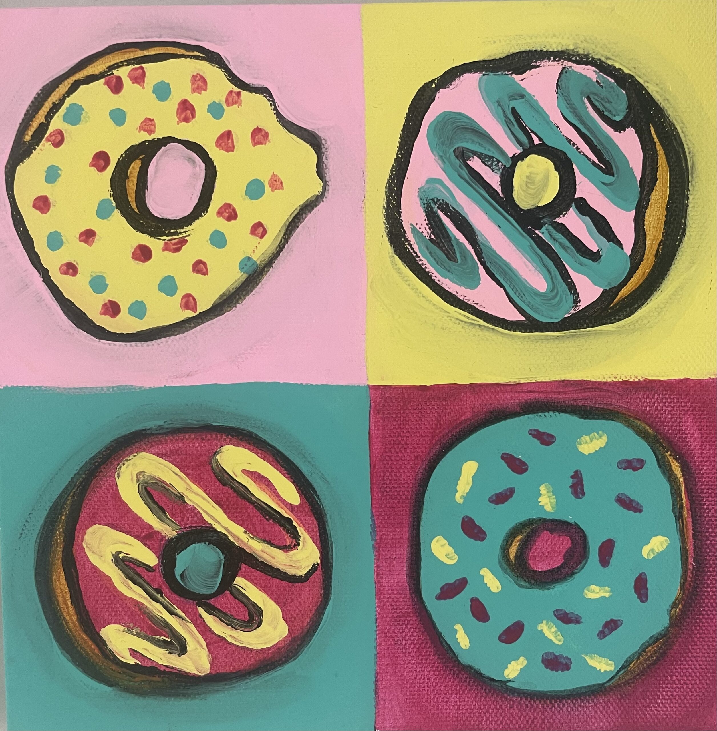 May 14 – Pop Art Donut Painting – (Students will paint an acrylic picture of their donut…before eating it!! Pop Art is an art movement that emerged in the United Kingdom and the United States during the min-to-late 1950’s. The movement presented a challenge to the tradition of fine art by including imagery from popular and mass culture, including advertising, comic strips, product packaging, celebrities and everyday consumer goods–into painting, sculpture and printmaking.